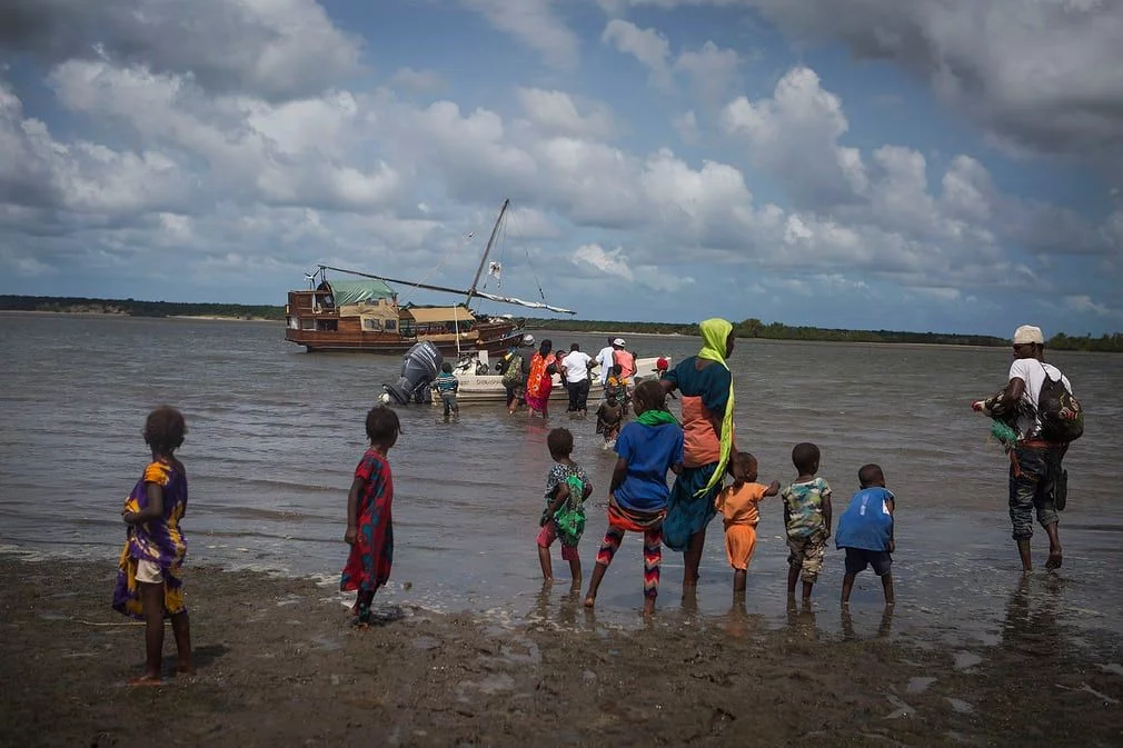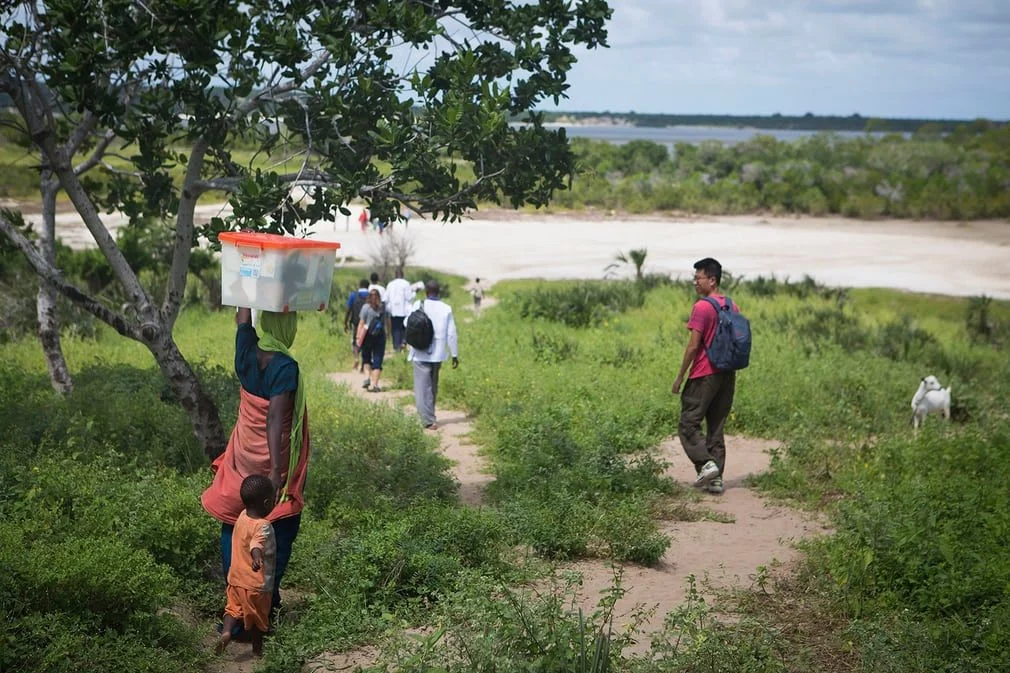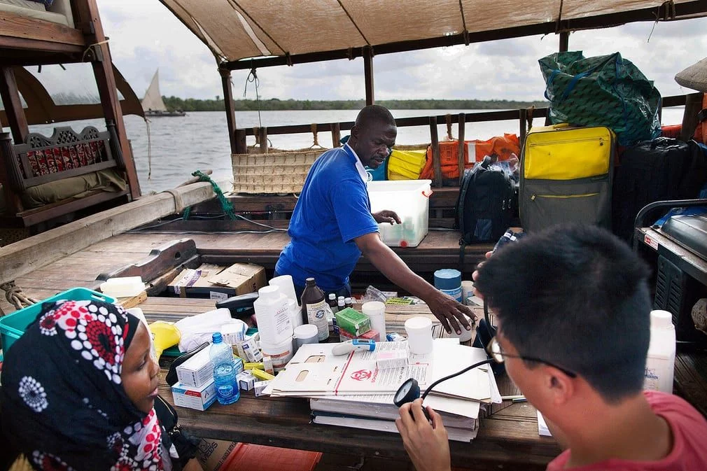 船只靠岸,医生们卸下医疗用品,准备向肯尼亚东部的圭湾村人民提供物资和医疗援助。