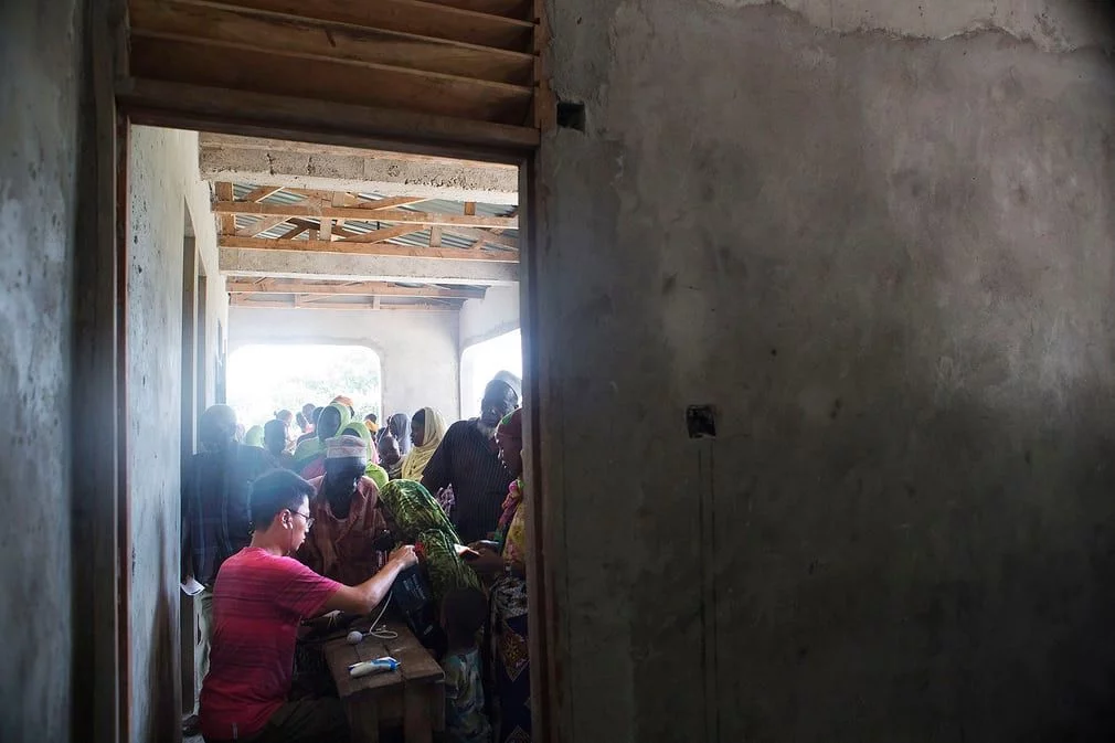 在临时诊所里,来自当地的村民在排队接受检查。