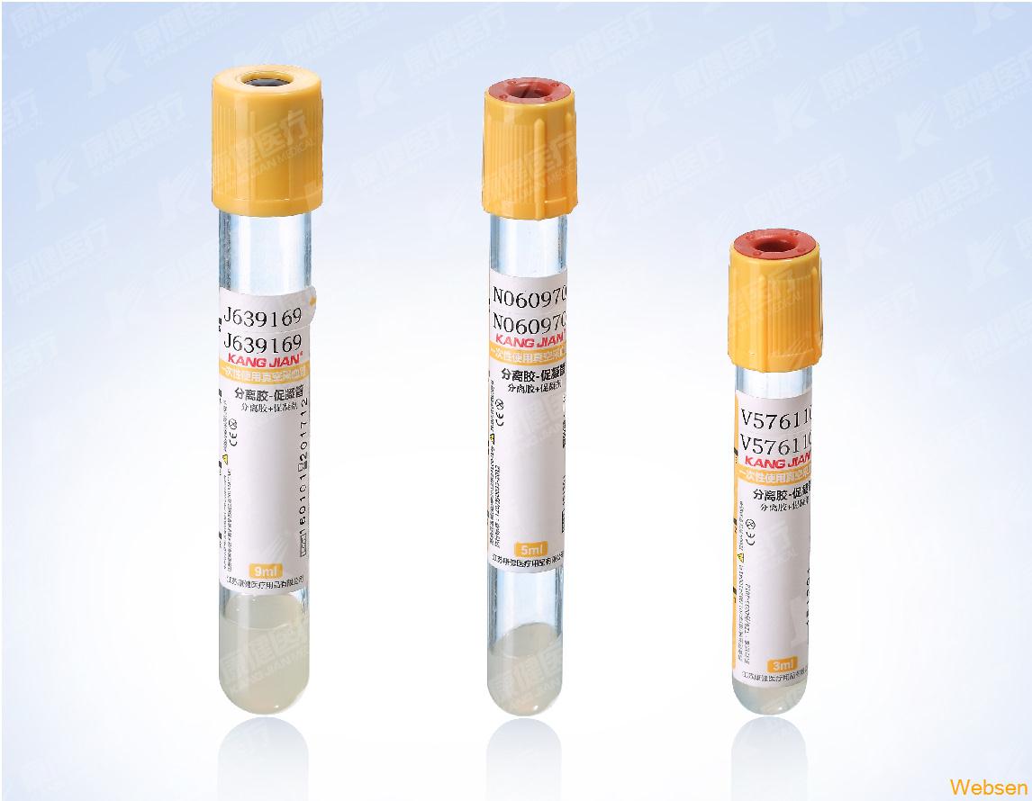 用于血清生化学、免疫学、药物检测等,内壁上均匀涂布促凝剂,可大大缩短血液凝固时间,由于引进的日本进口分离胶为纯净物,其物理化学性质较稳定,抗高温能力强,有效避免储运过程中,分离胶分解变性,离心后的分离胶固化形成屏障,将血清与血细胞完全分离,有效阻止两者间的物质交换,获得高质量的血清,使检测结果更加真实,提高血清的收集率,保持血清稳定时间超过48小时,其生化性质及化学构成不发生显著变化,可直接上机。血块完全收缩时间为20-25分钟,离心转速为3500-4000转/分,离心时间5分钟,建议贮存温度4℃-25℃。
